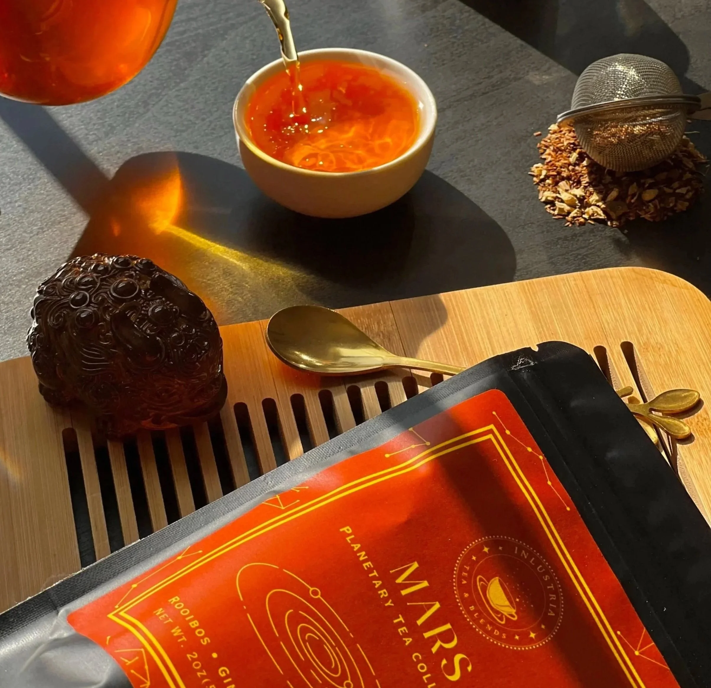 A Mars-inspired herbal tea featuring rooibos, ginger, and cinnamon for a bold, fiery cup. Perfect for tea lovers who enjoy warming flavors, energy, and cosmic-inspired experiences. Read how we made this blend here!